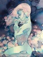 A3 painting of blue praying lady, food colouring on cartridge paper.
