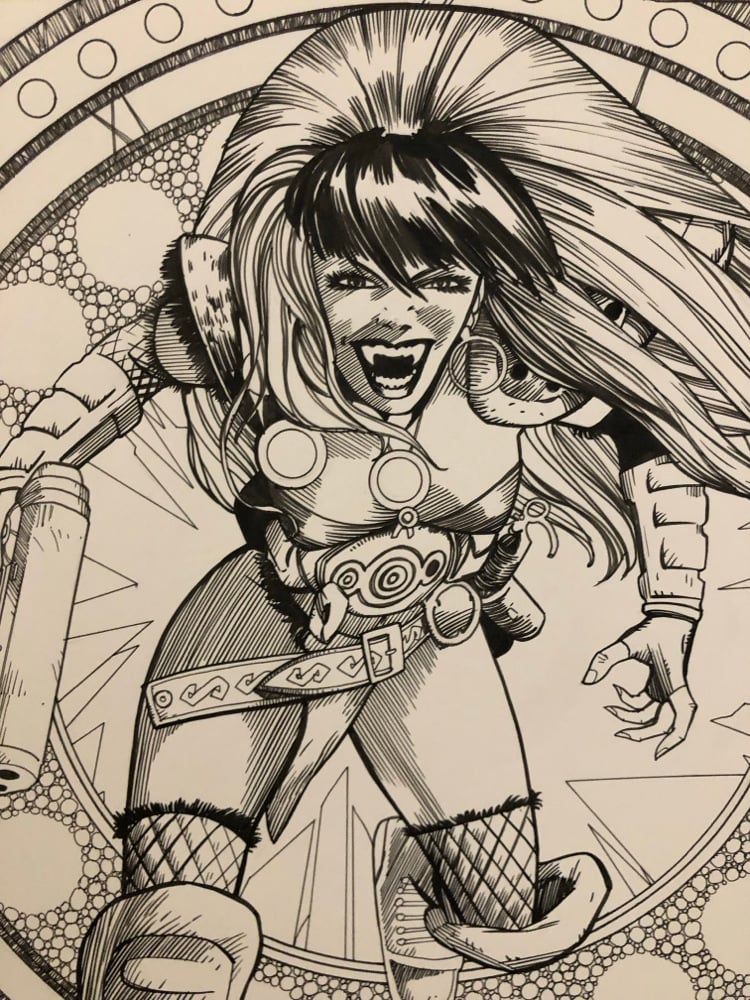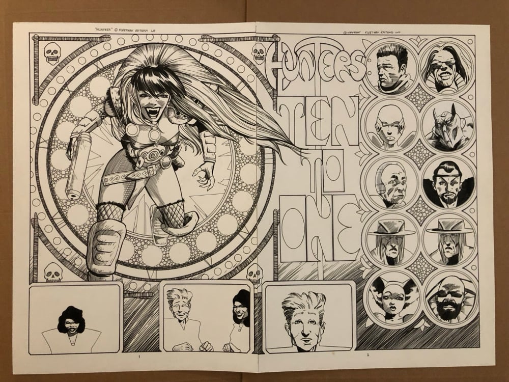 A2 sized double page spread of Durham Red (2000AD) sample from 1999. Ink on heavy cartridge paper.